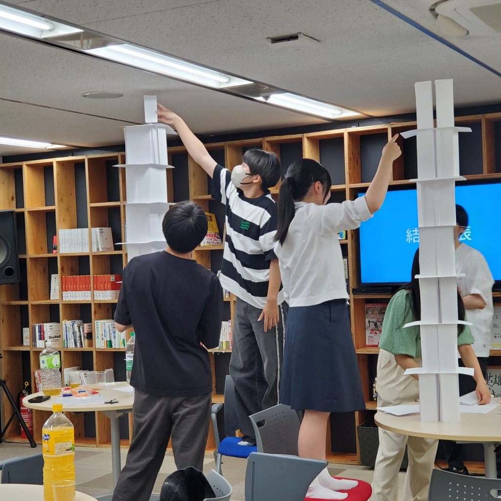 今回は株式会社ATOMicaが運営・企画するファーストペンギンの第1弾。3名の高校生が参加しました。講演あり、ピッチありの起業体験プログラムの中でも、この日一番の盛り上がりを見せたのは最後のペーパータワーだったかもしれません。参加者の男子高校生と今回のイベントのサポートをしていただいた秋田大学生の鈴木さん、女子高校生2名の男女にチーム分けして、それぞれのチームで作るペーパータワーの高さを競います。一見遊びのようですが、これは実際にチームビルディング研修にも採用されているのです。初対面だったにもかかわらず、夢中でタワーを作るうちにチームの結束も固くなったみたいですね。